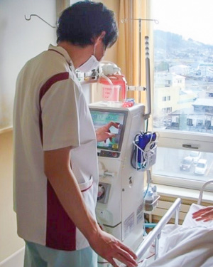 透析室は2床で、入院中の透析患者管理のみで外来での維持透析は行っていません。その他の業務として、持続緩徐式血液ろ過(CHDF)、白血球除去療法(LCAP)、胸・腹水濾過濃縮再静注法(CART)などを行っています。