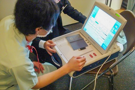 ペースメーカー植込み対応、外来での定期的なペースメーカーチェックや、植込み型除細動器(ICD)、両室ペーシング機能付き植込み型除細動器(CRT-D)のチェックを行っています。また、2016年より遠隔モニタリングシステムを導入しています。