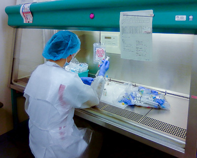 がん治療に用いる抗がん薬を安全に使用するために、薬剤科では化学療法レジメン(投与計画)の審査や登録、確認作業を行っています。患者さんが、がん化学療法を行う際には事前に薬剤師が効果や副作用について説明を行います。注射剤で治療を行う場合、治療当日は、抗がん薬専用設備(安全キャビネット:下図)を使用して、効率的で最適な注射用抗がん薬の量を患者さんへ投与できるように調製を行っています。